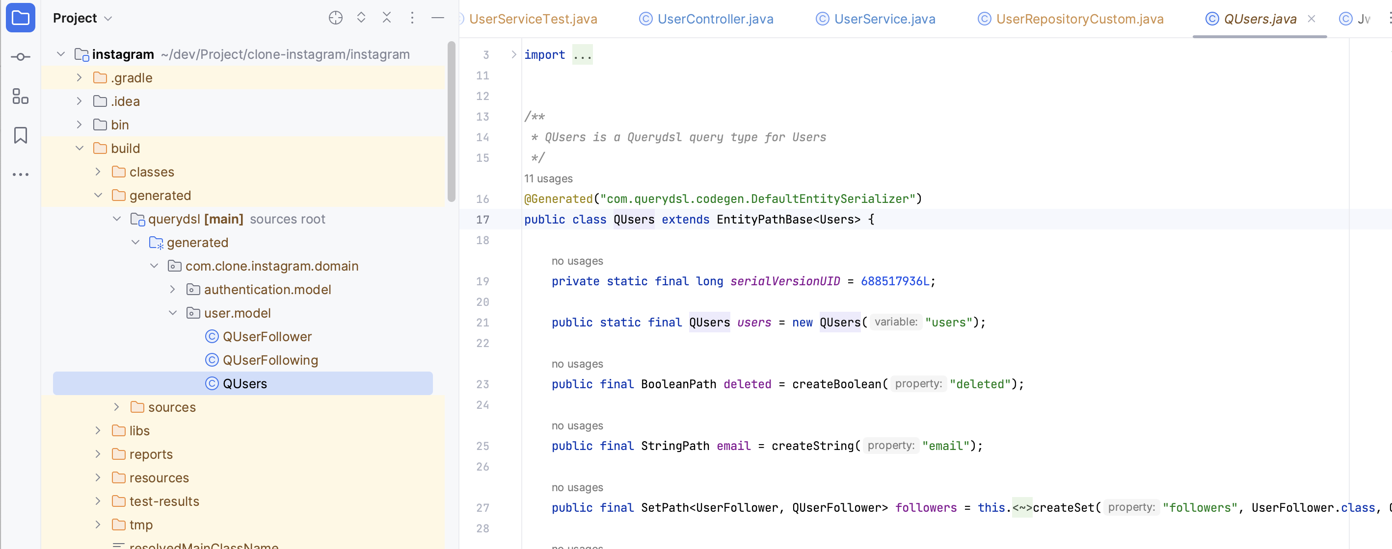 build/generated/querydsl 아래에 Q파일이 생성된 것을 확인할 수 있습니다.